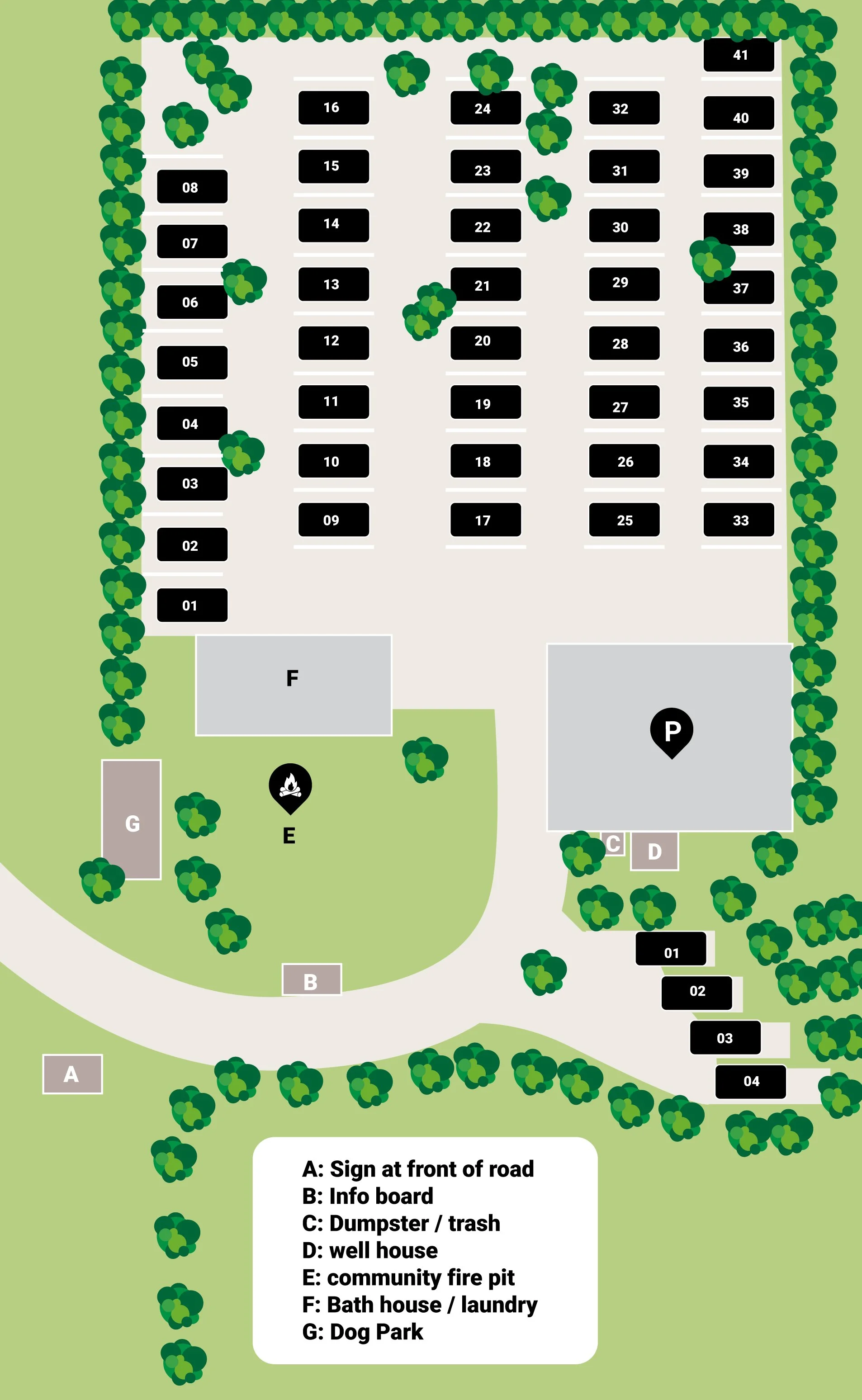 Spacious 30' x 58' gravel back-in site with full hookups, including 50/30/20-amp electric, water, sewer, and WiFi. Ideal for a peaceful stay tucked into the trees—just back in, hook up, and relax.